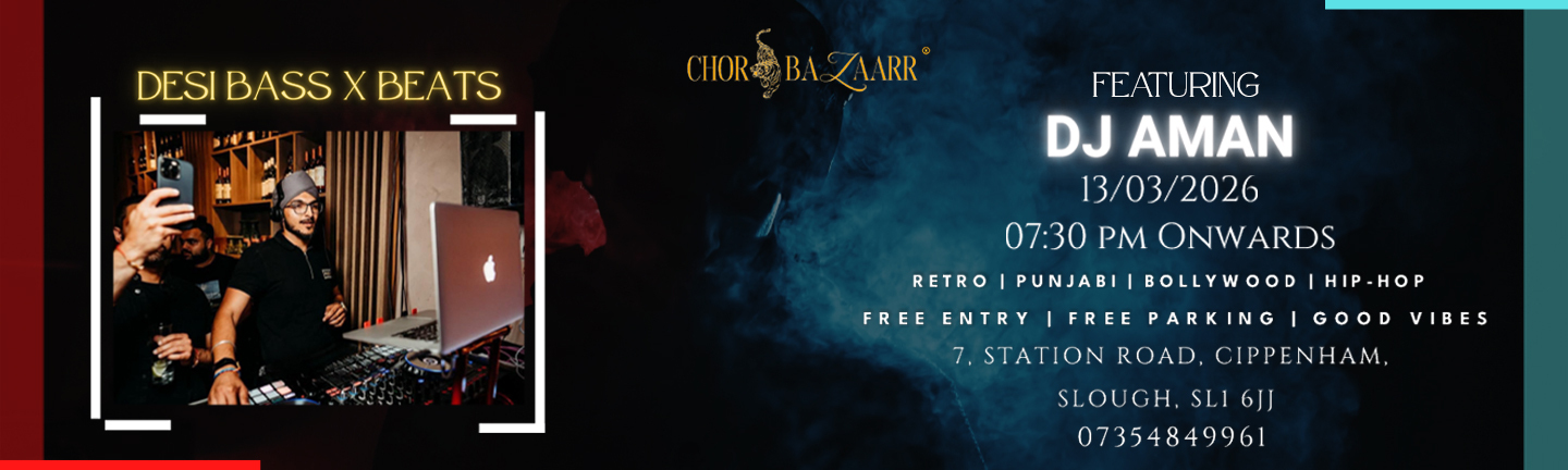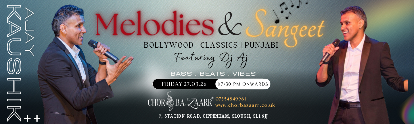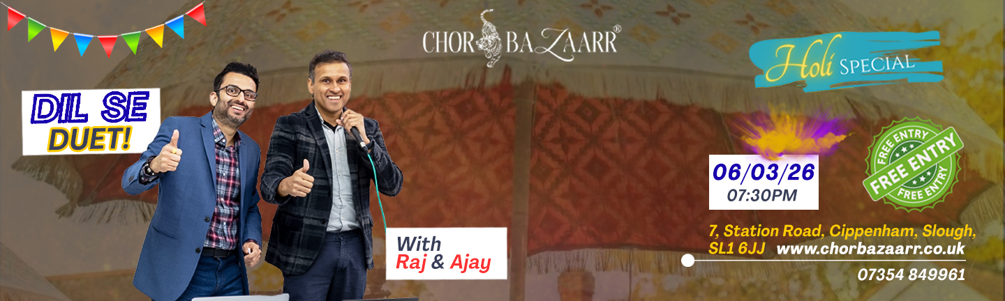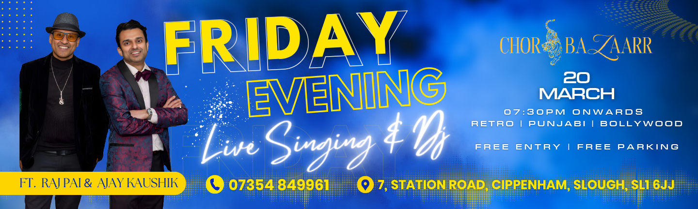 Join us for an unforgettable Friday evening at Chor Bazaarr!  Enjoy live singing and DJ performances featuring Raj Pai & Ajay Kaushik, spinning your favourite Retro, Punjabi, and Bollywood hits.  Date: Friday, 20 March  Time: 7:30 PM onwards Venue: 7, Station Road, Cippenham, Slough, SL1 6JJ Highlights: Live…